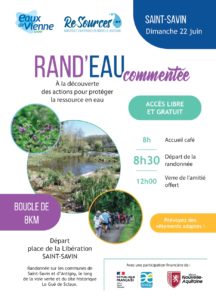 Eaux de Vienne organise une randonnée commentée à la découverte des actions mises en place pour protéger la ressource en eau. Elle aura lieu le dimanche 22 juin à 8h00. La boucle de 8 km passera par les communes de Saint Savin et d’Antigny et sera ponctuée d’interventions d’acteurs du territoire : agriculteurs et animateurs ??.