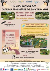 À l’occasion de l’inauguration des Jardins Éphémères de Saint-Fraigne, qui aura lieu le samedi 7 juin 2025, le SMABACAB et le SIAEP Nord-Ouest Charente vous invitent à participer à un atelier de sensibilisation aux enjeux de l’eau. Autour d’une maquette ludique et interactive commentée par l’EPTB Charente, venez découvrir le fonctionnement d’un bassin versant et les aménagements possibles pour préserver la ressource en eau.